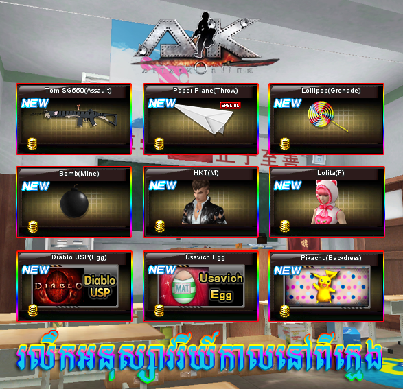 ពេលវេលាដ៏រំភើបបានមកដល់ហើយ នោះគឺជាការកម្សាន្តជាមិត្តភត្តិក្នុង AK Online ក្នុងវគ្គថ្មីដែលពោរពេញដោយការប្រកួតប្រជែងគ្មានដែនគំណត់។សម្រាប់ការ update version ថ្មីនេះពិតជាធ្វើអោយអ្នកកម្សាន្តទាំងឡាយនឹងមានអារម្មណ៍ប្លែកភ្នែកជាក់ជាមិនខាន់នោះគឺ Giant Room។ពិសេសជាងនេះទៅទៀតនោះគឺសព្វាវុធទំនើបៗអស្ចារ្យនិងសំភារៈគួរឲ្យចាប់អារម្មណ៍ រួមទាំងសំលៀកបំពាក់ដ៏ស្រស់ស្អាតតាមបែបយុវវ័យដែលចូលចិត្តអ្វីដែលទាន់សម័យនឹងស្រស់ស្អាត។ចំពោះការ update version ថ្មីនេះ នឹងធ្វើឡើងនៅ ថ្ងៃចន្ទ័ទី ០៩ ខែធ្នូ ឆ្នាំ២០១៣ នេះហើយ។