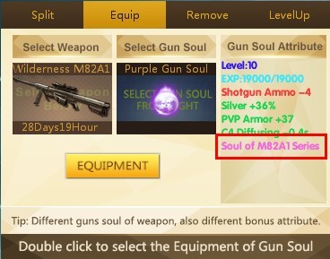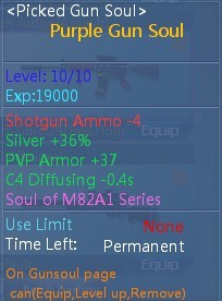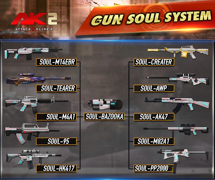 Soul of M82A1, Soul of AK47, Soul of M4A1, Soul of AWP, Soul of QBZ95, Soul of PP2000, Soul of HK417, Soul of M14EBR, Soul of Creater, Soul of Tearer និង Soul of Bazooka