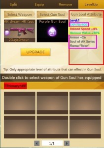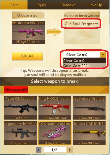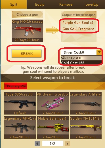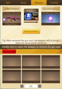 អ្នកអាចទទួលបាន Soul Fragment(Lv 1, Lv2 ឬ Lv3) ឬ Gun Soul(ត្បូង) ដែលមានពណ៌ខុសៗគ្នា តែត្រូវចំណាយ Silver ឬ Gold ហើយអាចកាំភ្លើងខ្លះមិនបាច់ចំណាយ តែសព្វាវុធដែលអ្នកធ្វើការបំបែកនោះនឹងត្រូវបាត់បង់។