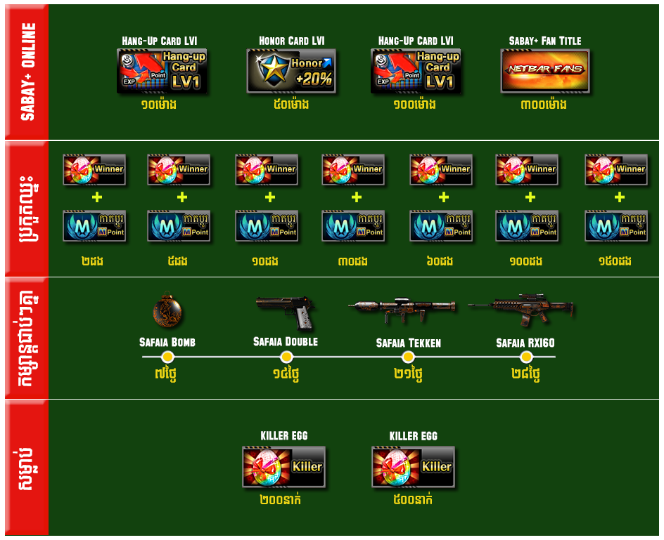 ចាប់ពី ថ្ងៃទី១៤ ដល់ថ្ងៃទី២៧ ខែធ្នូ ឆ្នាំ២០១៥ បន្ទាប់ពីការ update នូវ version 2.1.6.472 រួចរាល់ហើយអ្នកកម្សាន្ដទាំងអស់អាចបញ្ចូល AK Gold ដើម្បីទទួលបានសម្ភារៈពិសេសៗដូចខាងក្រោម៖