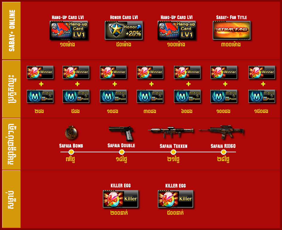ចាប់ពីថ្ងៃទី២២ ខែកុម្ភៈ ដល់ថ្ងៃទី៦ ខែមិនា ឆ្នាំ២០១៦ បន្ទាប់ពីការ update នូវ version 2.1.6.477 រួចរាល់ហើយអ្នកកម្សាន្ដទាំងអស់អាចចំណាយ AK Gold ដើម្បីទទួលបានសព្វាវុធ និងសម្ភារៈពិសេសៗដូចខាងក្រោម៖