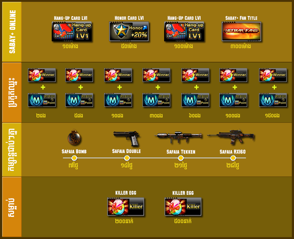 ចាប់ពីថ្ងៃទី១១ ដល់ថ្ងៃទី២៤ ខែមេសា ឆ្នាំ២០១៦ បន្ទាប់ពីការ update នូវ version 2.1.6.480 រួចរាល់ហើយអ្នកកម្សាន្ដទាំងអស់អាចបញ្ចូល AK Gold ដើម្បីទទួលបាន សព្វាវុធ និងសម្ភារៈពិសេសៗដូចខាងក្រោម៖