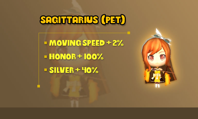 Sagittarius(Pet): Honor +100%, Silver +40%, Moving Speed +2%