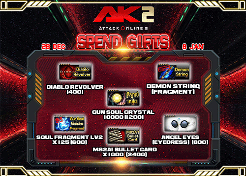 ចាប់​ពី​ថ្ងៃ​ទី​​២៦ ខែធ្នូ ឆ្នាំ២០១៦ ដល់​​​ថ្ងៃ​​៨ ខែមករា ​ឆ្នាំ​២០១៧ បន្ទាប់​​ពី​​ការ ​update ​នូវ ​version 2.1.6.502 រួច​​រាល់​​ហើយ​​អ្នក​​កម្សាន្ដ​​ទាំង​​អស់​​អាច​​ចំណាយ​ AK Gold ​​ ​ដើម្បី​​ទទួល​​បាន​​​​សម្ភារៈ​ពិសេស​ៗ​ដូច​ខាង​ក្រោម៖
