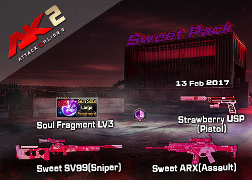 -កញ្ចប់ Sweet: ទទួលបាន Jewel ចាប់ពី ១ ដល់ ៣ រួមនិង Sweet ARX(Assault)(៣ថ្ងៃ ឬ៧ថ្ងៃ ឬ១៥ថ្ងៃ) ឬ Sweet SV99(Sniper)(៣ថ្ងៃ ឬ៧ថ្ងៃ ឬ១៥ថ្ងៃ) ឬ Strawberry USP(Pistol)(៣ថ្ងៃ ឬ៧ថ្ងៃ ឬ១៥ថ្ងៃ) ឬ Soul Fragment LV3(១០០សន្លឹក)។