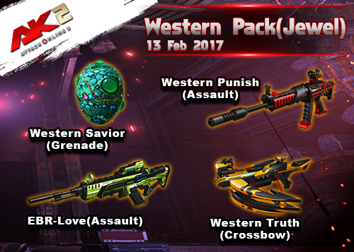 -កញ្ចប់ Western: ទទួលបាន Jewel ចាប់ពី ២ ដល់ ៤ រួមនិង Western Punish(Assault)(៣ថ្ងៃ ឬ៧ថ្ងៃ ឬ១៥ថ្ងៃ) ឬ Western Truth(៣ថ្ងៃ ឬ៧ថ្ងៃ ឬ១៥ថ្ងៃ) ឬ Western Savior(Grenade) ឬ EBR-Love(Assault)(១៥ថ្ងៃ)។