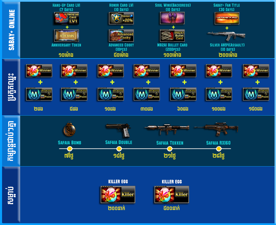 -Gemini Hard(Pack)៖ ទទួលបាន Glory Sword(Fragment)(3) រួមនិង: Fantasy(Melee)(៣ថ្ងៃ ឬ ១៥ថ្ងៃ ឬ ៣០ថ្ងៃ) ឬ Serum(5) ឬ Reborn Card(2) ឬ Gun Soul Crystal(1000)(*1) ឬ King’s Double Spray (Shotgun)(៣ថ្ងៃ ឬ ៧ថ្ងៃ)