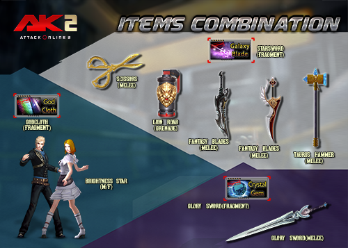 -Virgo Easy(Pack)៖ ទទួលបាន Glory Sword(Fragment)(1) រួមនិង: Scissors(Melee)(១ថ្ងៃ ឬ ៣ថ្ងៃ ឬ ១៥ថ្ងៃ) ឬ Serum(3) ឬ Reborn Card(1) ឬ Gun Soul Crystal(500)(*1) ឬ Dual Moon(Eardress)(៣ថ្ងៃ ឬ ៧ថ្ងៃ)