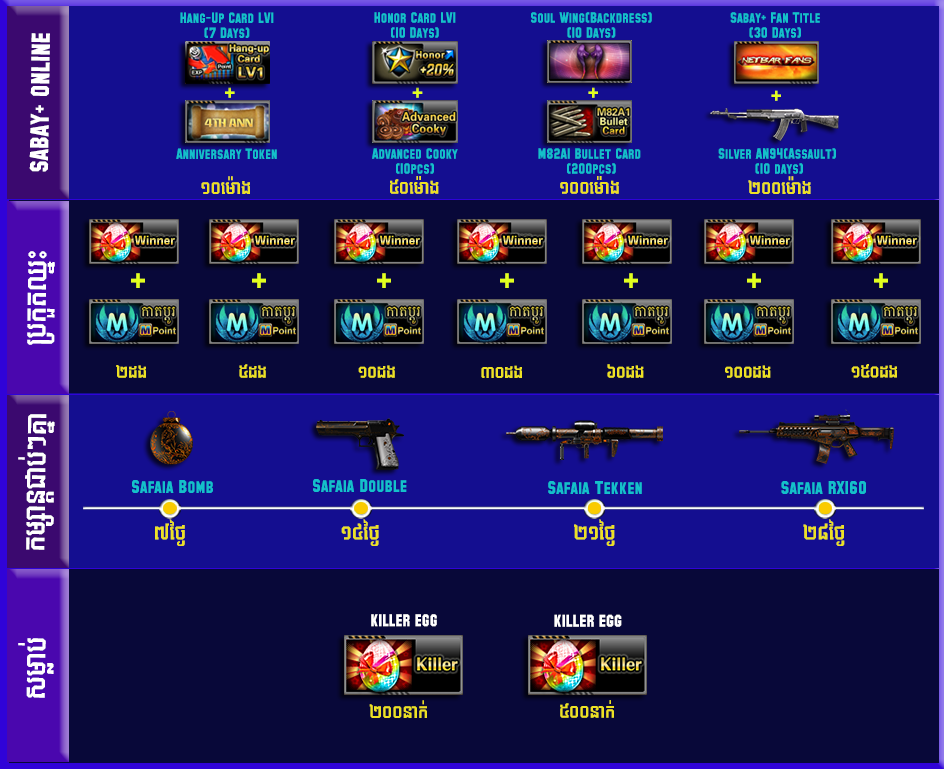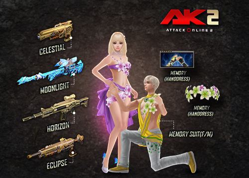 (Horizon(Assault), Moonlight(Sniper), Celestial(Pistol), Eclipse(Shotgun), Memory(Headdress), Memory(Armlet) និង Memory Suit(M or F)) រយៈពេល៣០ថ្ងៃ