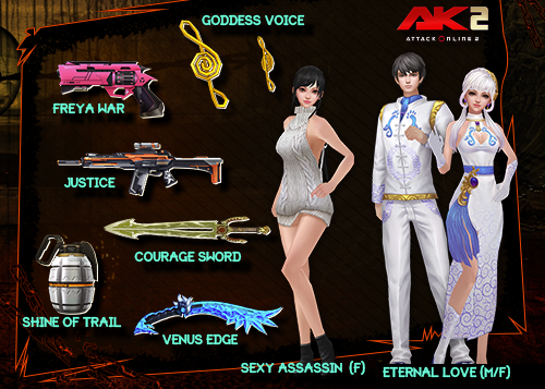 (Venus Edge(Melee), Courage Sword(Melee), Shine of Trail(Grenade), Freya War(Pistol), Justice(Assault), Goddess Voice(Eardress) និង Eternal Love(M or F)) រយៈពេល៣០ថ្ងៃ