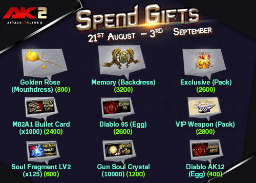 ចាប់ពីថ្ងៃទី២១ ខែសីហា ដល់ថ្ងៃទី៣ ខែកញ្ញា ឆ្នាំ២០១៧ បន្ទាប់ពីការ update នូវ versionពី 2.1.6.521 ទៅ 2.1.6.522 រួចរាល់ហើយអ្នកកម្សាន្ដទាំងអស់អាចចំណាយ AK Gold ដើម្បីទទួលបានសម្ភារៈពិសេសៗដូចខាងក្រោម៖