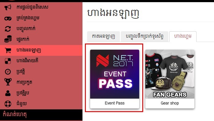 -ចុចចូលហាងអនឡាញ ហើយយកពាក្យថា “ហាងឡាញ” នោះអ្នកនឹងឃើញពាក្យថា “Event Pass”ដូចរូបខាងក្រោម