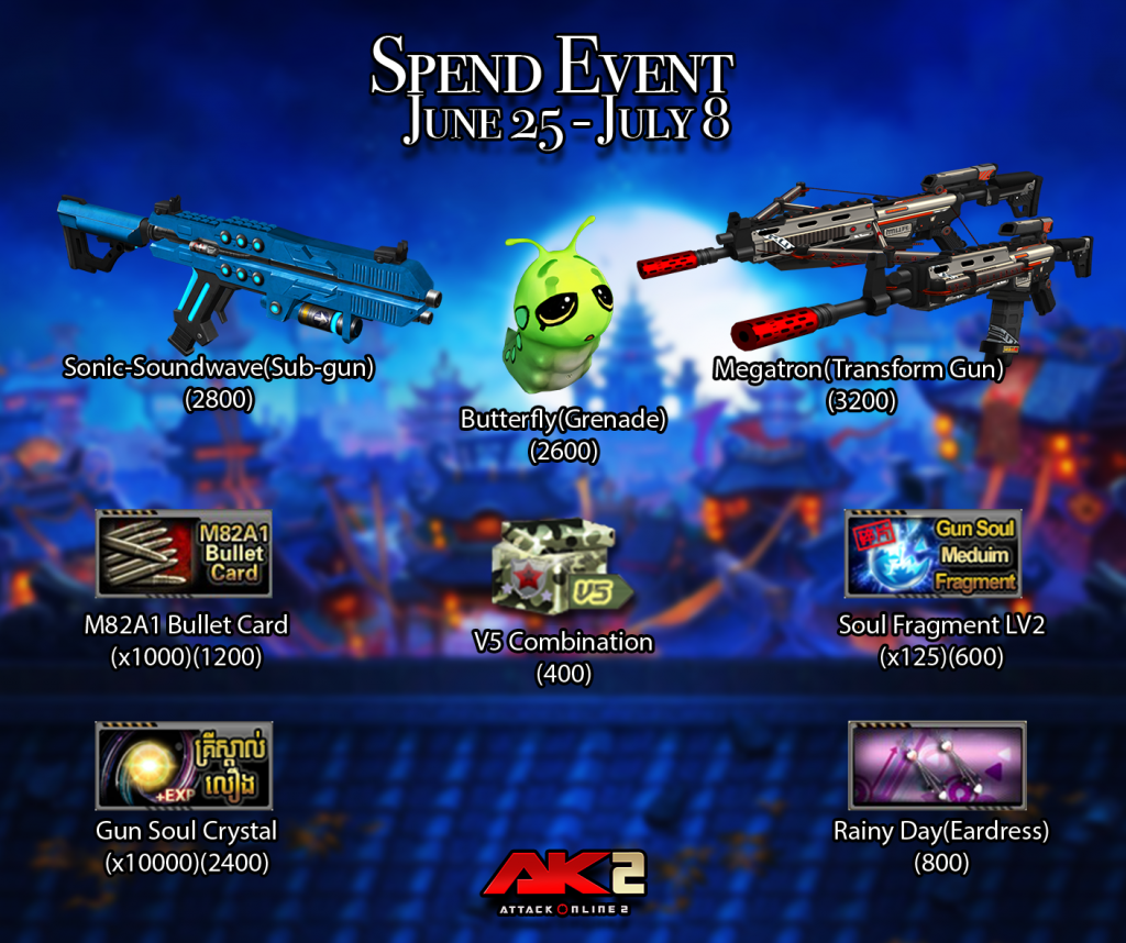 ចាប់ពី ថ្ងៃទី២៥ ខែមិថុនា ដល់ ថ្ងៃទី៨ ខែកក្កដា ឆ្នាំ២០១៨ បន្ទាប់ពីការ update នូវ version 2.1.6.547 ទៅ 2.1.6.549 រួចរាល់ហើយអ្នកកម្សាន្ដទាំងអស់អាចចំណាយ AK Gold ដើម្បីទទួលបានសម្ភារៈ ពិសេស ៗ ដូច ខាង ក្រោម៖
