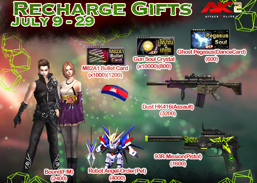 ៩.៤០០០ AK Gold ទទួលបាន Robot Angel-Order(Pet)(1):Robot Angel, Ullier, can switch between the gun form of order and angel form., Angel Shape: Moving Speed+2%, Learn Skill No Failed, Resist a friendly flash, Honor+100%, Silver+50%, Watcher Blade Shape: kill enemy in PVE mode recover AP, in PVE mode Drop Rate+2, in PVE Mode Final Damage+1, Honor+50%, Silver+100%
