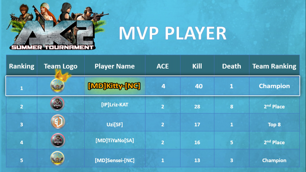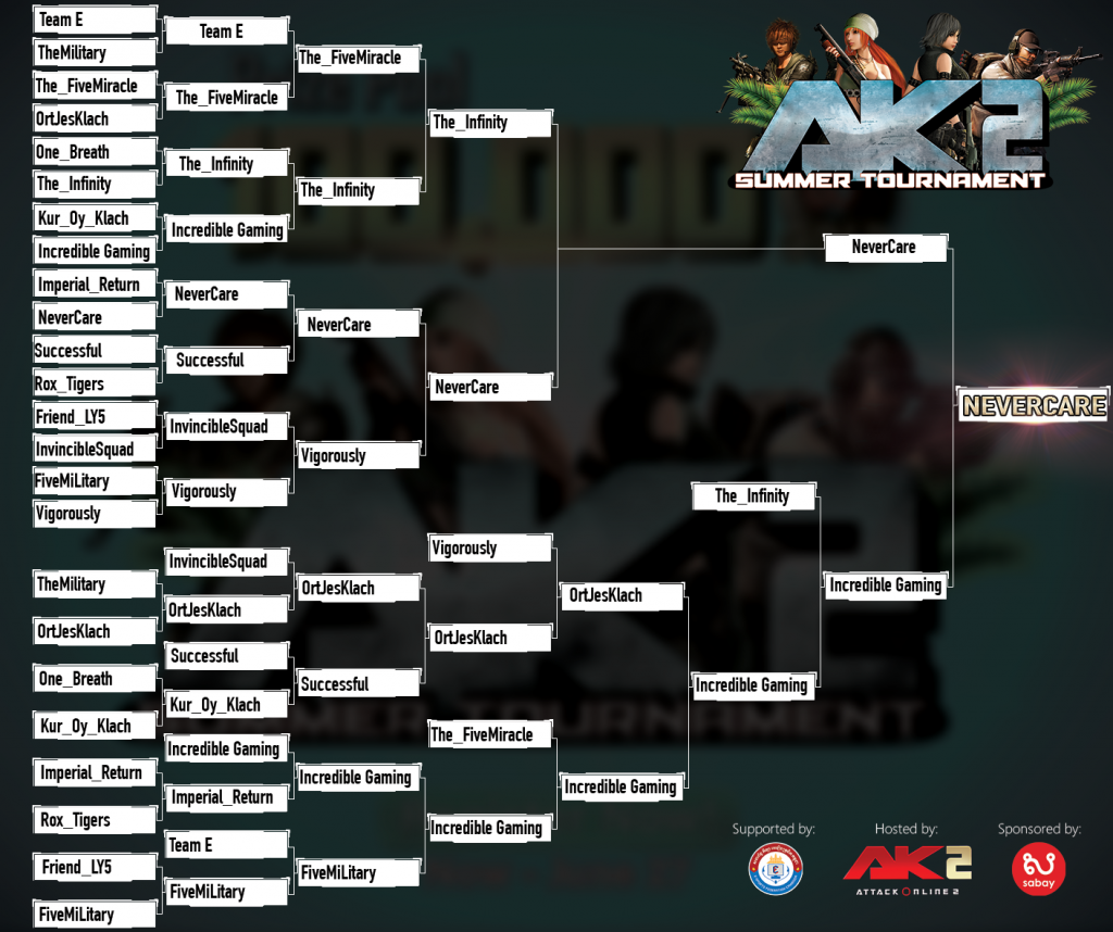 ការជម្រុះជុំផ្តាច់ព្រ័ត្របានបញ្ចប់ហើយ យើងបានរកឃើញម្ចាស់ជើងឯកប្រចាំការប្រកួតAK2 Summer Tournamentគឺ ក្រុម NeverCare សូមអបអរសាទរ។ ខាងក្រោយនេះជាតារាងសង្ខេបពីពិន្ទុការប្រកួតសប្តាហ៍នេះ៖