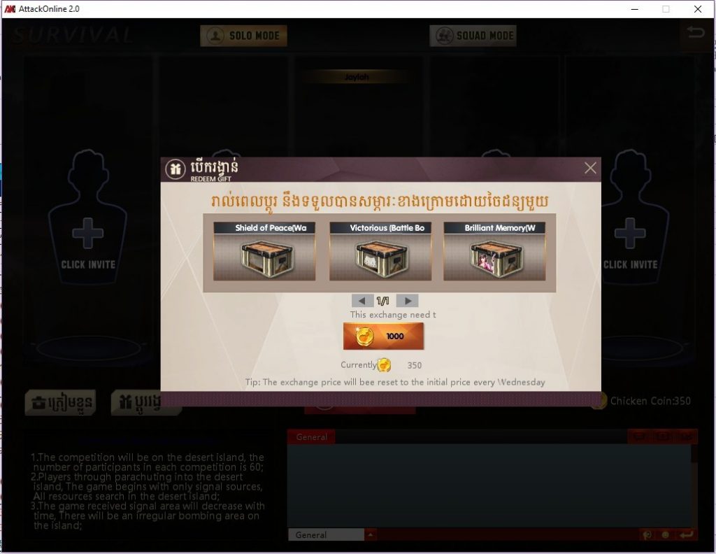 ពេលដែលអ្នកលេងឈ្នះឬចាញ់នោះអ្នកនឹងទទួលបាន Chicken Coin ដែលអ្នកយកប្តូរជារង្វាន់សម្ភារៈដែលសម្រាប់ប្រើក្នុង វគ្គ Battle Royale នេះតែប៉ុណ្ណោះ។ រៀងរាល់ការប្តូរនេះ Chicken Coinដែលត្រូវការ នឹងកើន100, 200, 400, 800…..ហើយជារៀងរាល់ថ្ងៃពុធនឹងធ្វើការកំណត់Chicken Coinដែលត្រូវការសម្រាប់ប្តូរជាថ្មី។