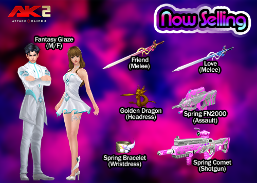 (Love(Melee) or Friend(Melee), Spring Bracelet(Wristdress), Golden Dragon(Headress), Spring FN2000(Assault), Spring Comet(Shotgun) និង Fantasy Glaze(M or F)) រយៈពេល7ថ្ងៃ