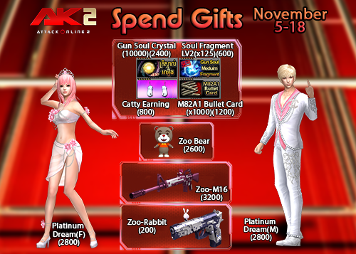 ចាប់ពី ថ្ងៃទី5 ដល់ ថ្ងៃទី18 ខែវិច្ឆិកា ឆ្នាំ2018 បន្ទាប់ពីការ update នូវ version 2.1.6.558 ទៅ 2.1.6.559 រួចរាល់ហើយអ្នកកម្សាន្ដទាំងអស់អាចចំណាយ AK Gold ដើម្បីទទួលបានសម្ភារៈពិសេសៗដូចខាងក្រោម៖