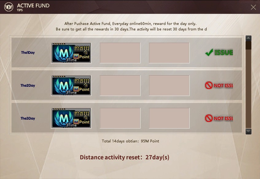 គ្រាន់តែចំណាយ39 AK Gold និង Online 60នាទី ជារៀងរាល់ថ្ងៃរយៈពេល ២សប្តាហ៍តែប៉ុណ្ណោះ នោះអ្នកអាចប្តូរយកសរុប 95M Point។ ព្រឹិត្តការណ៍នេះគឺមានសុពលភាពត្រឹមតែ30ថ្ងៃ រាប់ចាប់ពីថ្ងៃទិញ Fund។