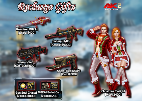 - អ្នកកម្សាន្តអាចកម្សាន្តក្នុងវគ្គ G-Mission 1-4(Hard) ទទួលបាន កាតទាំងបីខាងលើនេះ ហើយផ្គុំគ្នា នោះអ្នកនឹងទទួលបានកញ្ចប់មួយដែលមានឈ្មោះថា Merry X’mas(Pack)។ បើកវាអ្នកនឹងអាចទទួលបាន ៖ Lord of Abyss(Assault) ឬ Deer Horn(Headdress) ឬ Christmas Beard(Facedress) ឬ Flying Night(Grenade)។