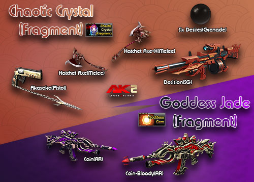 - សម្រាប់ Goddess Jade(Fragment) អ្នកផ្គុំជាមួយ Cain(AR)(60ថ្ងៃ) នោះអ្នកនឹងទទួលបាន Cain-Bloody(AR)(60ថ្ងៃ) ដែលមាន Attribute: God Series, The conscious state of the waking , cutting speed is super fast , changing the speed of super fast , increasing the speed of the gun , very fast rate of fire , special incentive icon , PVP exclusive skills: blood family contract , start to choose a teammate to sign a contract , Kill the enemy , all restore blood volume , wood mode does not take effect , PVE exclusive skills: Cain curse , start a teammate to sign a contract , the teammates damage to the monster , converted to Cain – blood damage Addition, There is an increase cap, Do not overlap with the same pet attribute