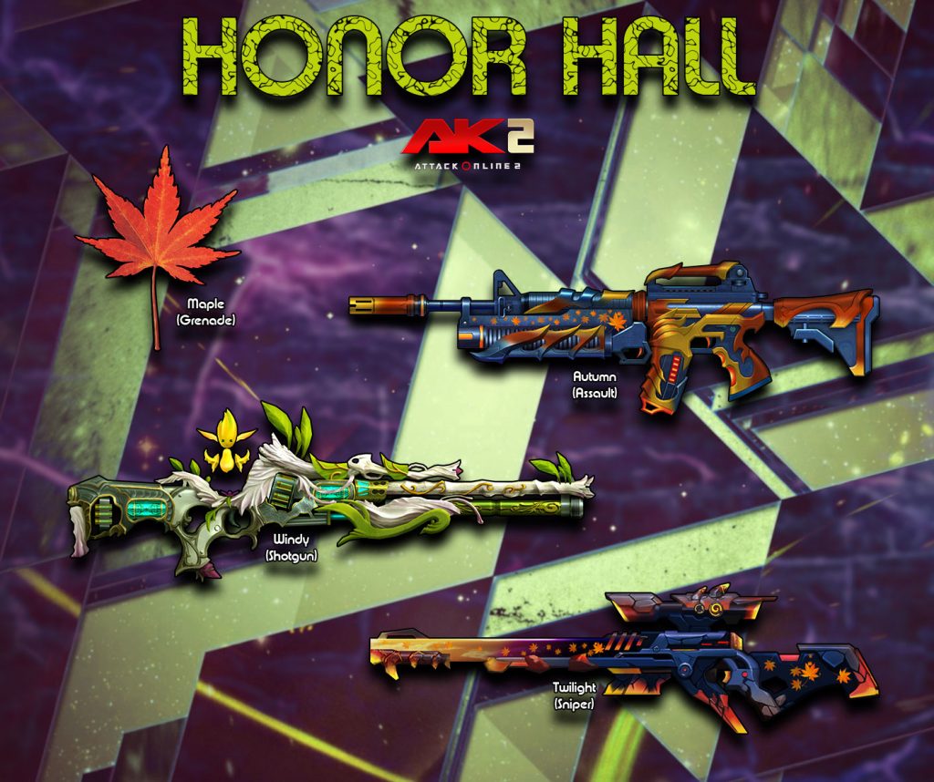 –កញ្ចប់ Galaxy Pack(Honor Hall): ទទួលបាន Honor Scroll ចាប់ពី 2 ដល់ 4 រួមនិង Autumn(Assault)(3ថ្ងៃ ឬ7ថ្ងៃ ឬ15ថ្ងៃ) ឬ Maple(Grenade)(3ថ្ងៃ ឬ7ថ្ងៃ ឬ15ថ្ងៃ)ងៃ) ឬ Twilight(Sniper)(3ថ្ងៃ ឬ7ថ្ងៃ ឬ15ថ្ងៃ) ឬ Windy(Shotgun)(3ថ្ងៃ ឬ7ថ្ងៃ ឬ15ថ្ងៃ)។