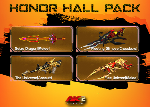 –កញ្ចប់ Dusk Pack(Honor Hall): ទទួលបាន Honor Scroll ចាប់ពី 2 ដល់ 4 រួមនិង The Universe(Assault)(3ថ្ងៃ ឬ7ថ្ងៃ ឬ15ថ្ងៃ) ឬ Fleeting Glimpse(Crossbow)(3ថ្ងៃ ឬ7ថ្ងៃ ឬ15ថ្ងៃ)ងៃ) ឬ Seize(Melee)(3ថ្ងៃ ឬ7ថ្ងៃ ឬ15ថ្ងៃ) ឬ Flee Unicorn(Melee)(3ថ្ងៃ ឬ7ថ្ងៃ ឬ15ថ្ងៃ)។