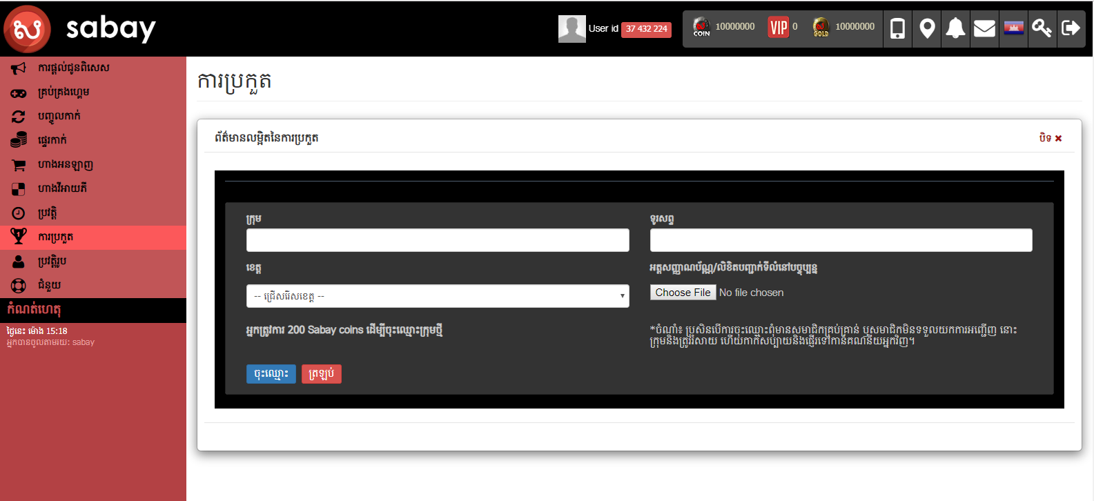 - បំពេញឈ្មោះក្រុម លេខទូរស័ព្ទរបស់អ្នកប្រកួត និងរូបអត្តសញ្ញាណប័ណ្ណ ឬ លិខិតស្នាក់នៅ