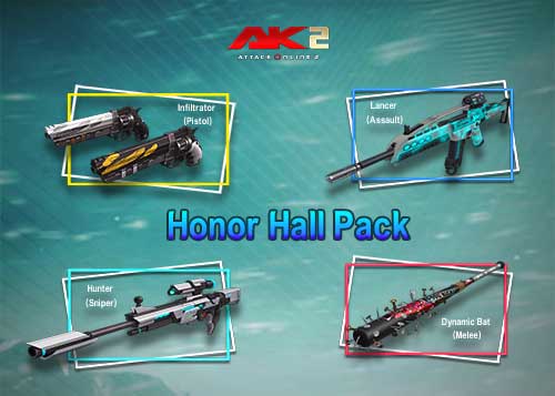 –កញ្ចប់ Dusk Pack(Honor Hall): ទទួលបាន Honor Scroll ចាប់ពី 2 ដល់ 4 រួមនិង Dynamic Bat(Melee)(3ថ្ងៃ ឬ7ថ្ងៃ ឬ15ថ្ងៃ) ឬ Hunter(Sniper) (3ថ្ងៃ ឬ7ថ្ងៃ ឬ15ថ្ងៃ) ឬ Infiltrator(Pistol) (3ថ្ងៃ ឬ7ថ្ងៃ ឬ15ថ្ងៃ) ឬ Lancer(Assault)(3ថ្ងៃ ឬ7ថ្ងៃ ឬ15ថ្ងៃ)។