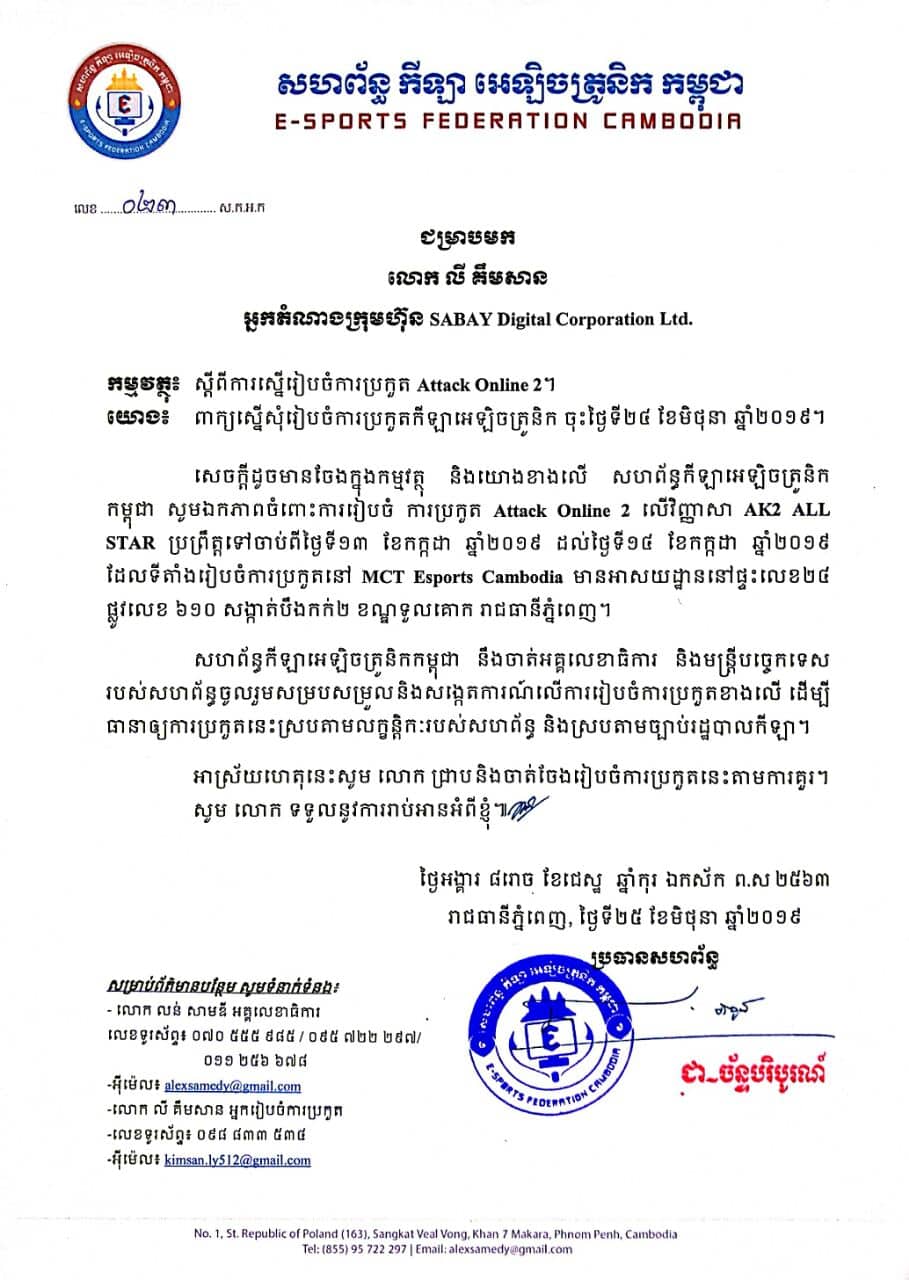 នេះជាលិខិតបញ្ជាក់ពី សហព័ន្ធ កីឡា អេឡិចត្រូនិក​ កម្ពុជា