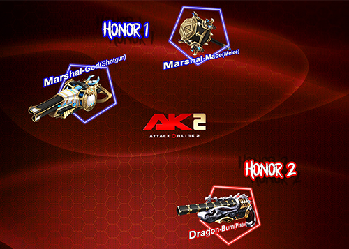 - Marshal-God(Shotgun) :Marshal Series,No Sale , Will not log in to the mall ,Honor debut exclusive tips , The first pair of wearing a shotgun ,High Damage ,shooting fast,Quick Switch Gun , Large capacity of the clip ,Moving fast, Excellent stability , Super strong armor , Special kill icon , The owner does not fall down , wears no wall , unlimited reloading clips in PVE mode , PVP exclusive skills – more killing brave: , hit can directly crush enemy armor, resulting in the temporary failure of enemy armor , Add Damage in PVE Mode