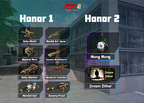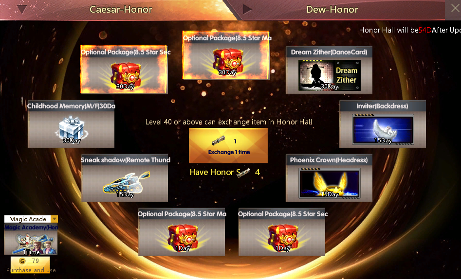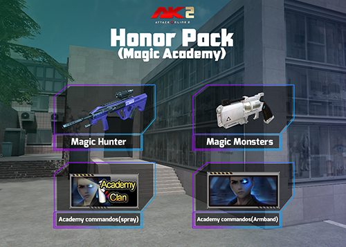 –កញ្ចប់ Spring(Honor Hall): ទទួលបាន Honor Scroll ចាប់ពី 2 ដល់ 4 រួមនិង Magic Monsters(Pistol)(3ថ្ងៃ ឬ7ថ្ងៃ ឬ15ថ្ងៃ) ឬMagic Hunter(Assault) (3ថ្ងៃ ឬ7ថ្ងៃ ឬ15ថ្ងៃ)ងៃ) ឬ Academy Commandos(Spray)(3ថ្ងៃ ឬ7ថ្ងៃ ឬ15ថ្ងៃ) ឬ Academy Commandos(Armband)(3ថ្ងៃ ឬ7ថ្ងៃ ឬ15ថ្ងៃ)។
