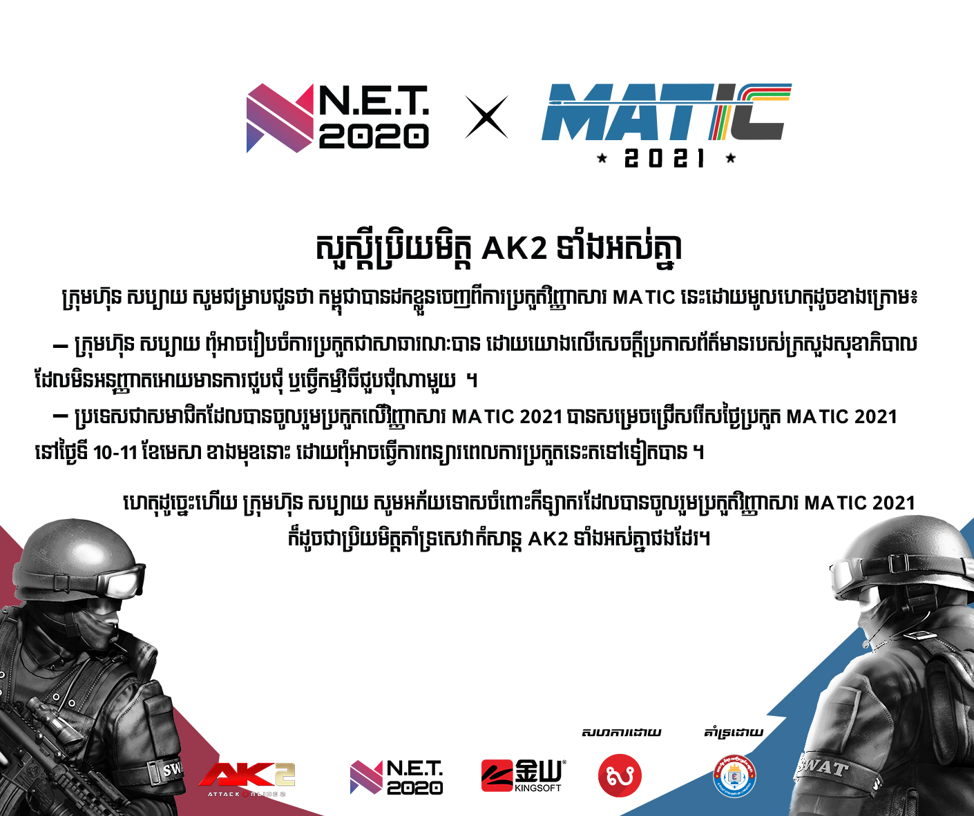 សួស្ដីប្រិយមិត្ត AK2 ទាំងអស់គ្នា! ដោយមានការទន្ទឹងរង់ចាំយូពីសំណាក់ប្រិយមិត្ត នឹងកីឡាកររបស់កម្ពុជាយើងសម្រាប់ការប្រកួតលើ វិញ្ញាសារ MATIC 2021 ក្រុមហ៊ុន សប្បាយ សូមជម្រាបជូនថា កម្ពុជាបានដកខ្លួនចេញពីការប្រកួតវិញ្ញាសារ MATIC 2021 នេះដោយមូលហេតុដូចខាងក្រោម៖