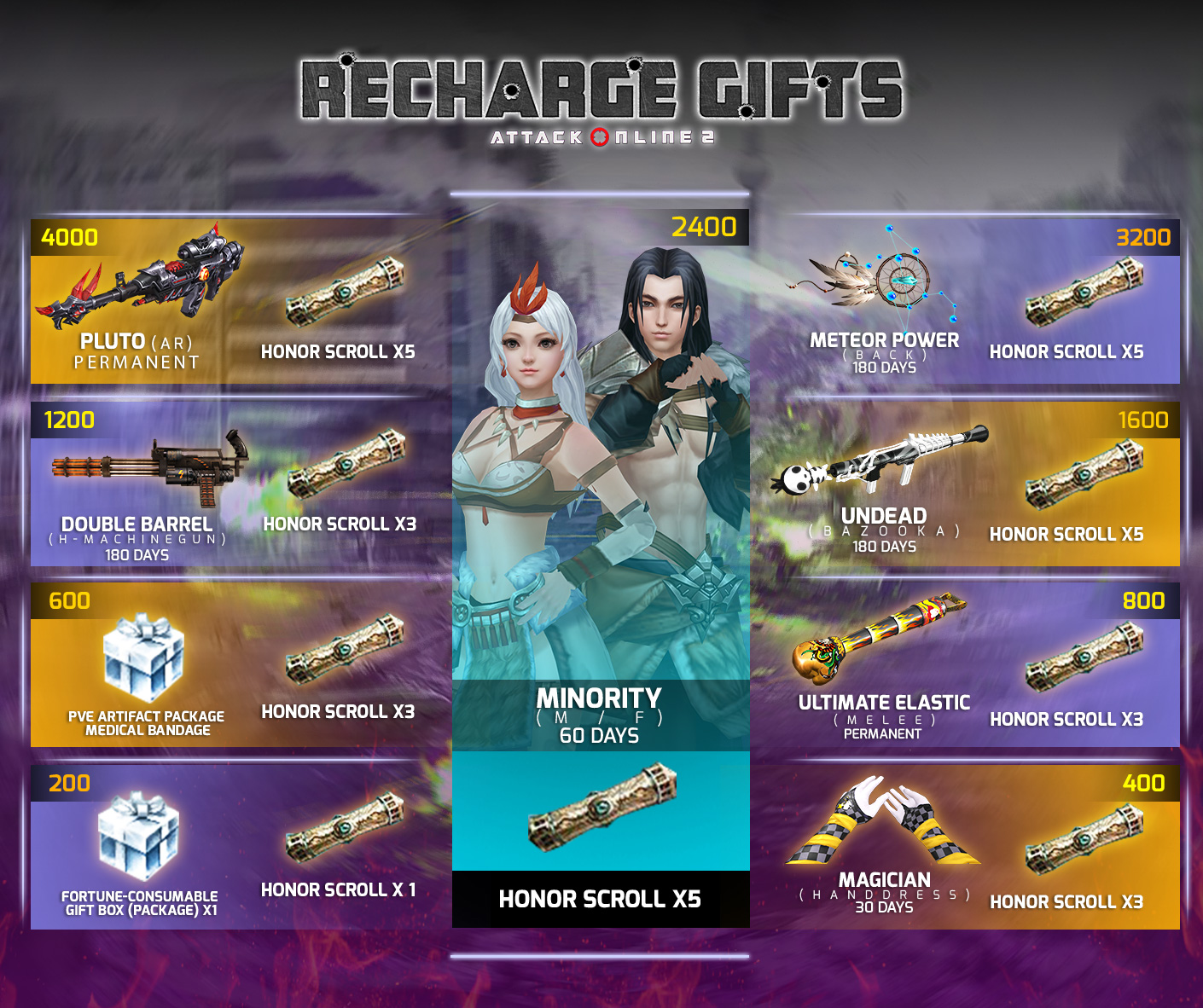 7. ​2400 AK Gold ទទួលបាន    Minority(M/F) (60ថ្ងៃ),Honor Scroll *5 , Mischief(Fragment)*100និង Space Treasure chest Free Coupon *4