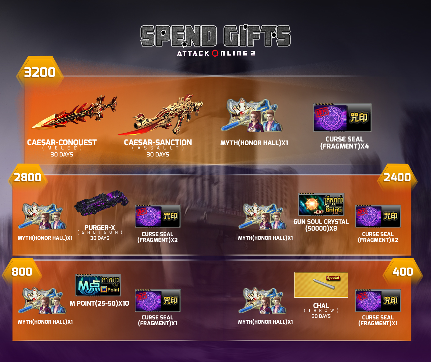 4. 2800 AK Gold បាន Purger-X(Shotgun)30Days + Curse Seal(Fragment)*2 + Elemental force(fragment)*5+ Myth(Honor Hall)*1