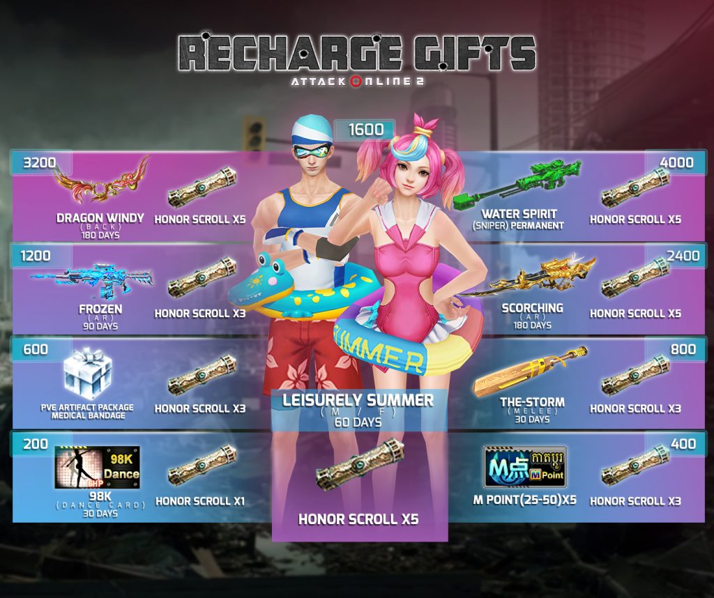 6. 1600 AK Gold ទទួលបាន Leisurely Summer(M/F)(60ថ្ងៃ),Honor Scroll *5 , Space Treasure chest Free Coupon *2 និង Gathering Water(Fragment)*60