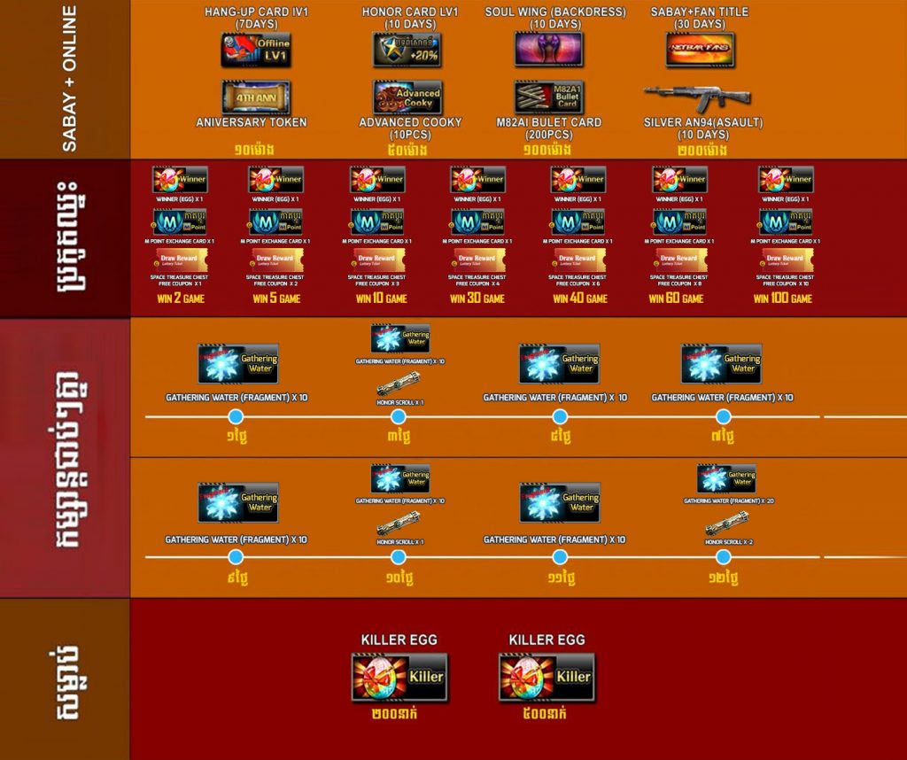 1. 200 AK Gold ទទួលបាន 98K(Dance Card) (30ថ្ងៃ), Honor Scroll *1, Space Treasure chest Free Coupon *1 និង Gathering Water(Fragment)*30