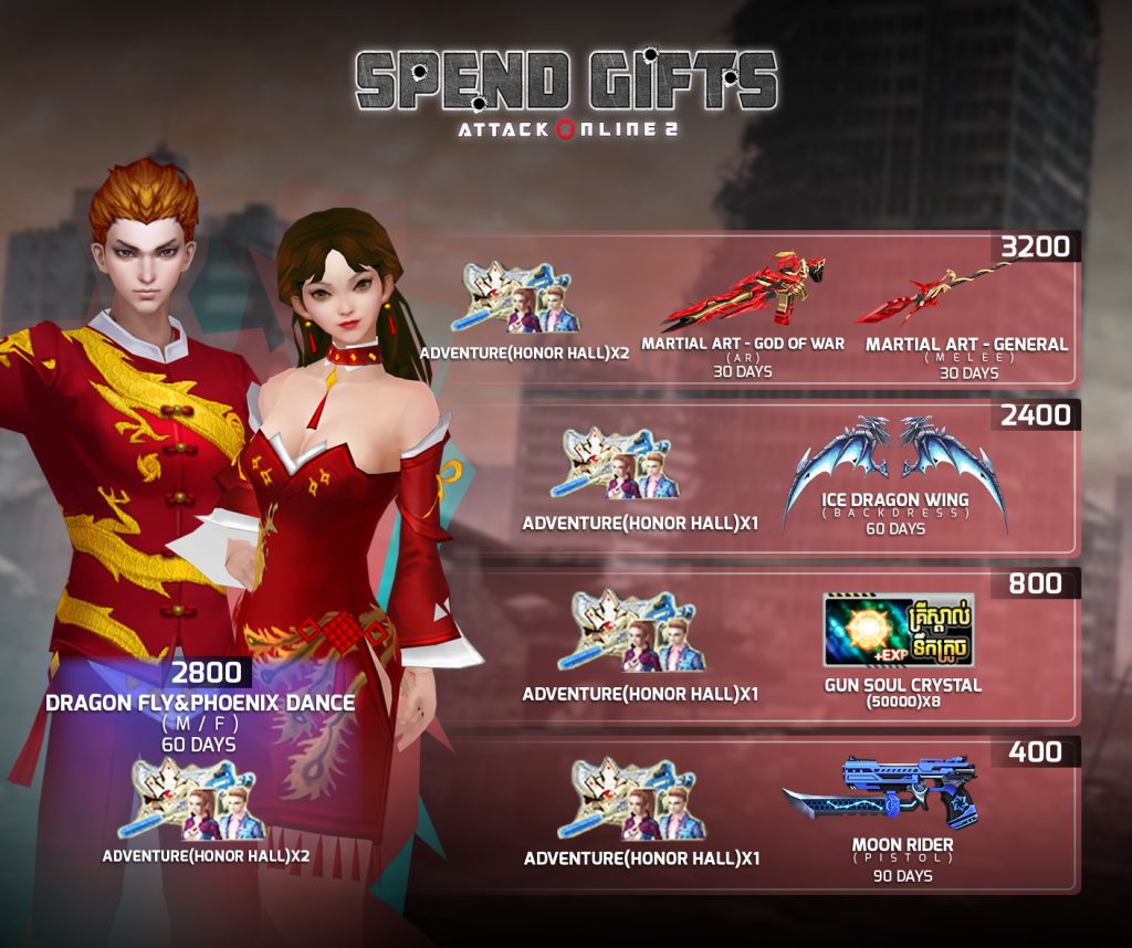 4. 2800 AK Gold បាន Adventure(Honor Hall)*2 + Dragon Fly(M)/Phoenix Dance(F) 30Days