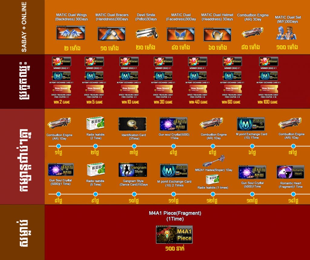 1. 200 AK Gold ទទួលបាន Space treasure chest free coupon*1 + Dynamic (Honor hall)*1 +Combustion Engine(AR) 3Days + Devil Smile(Pistol) 3Days