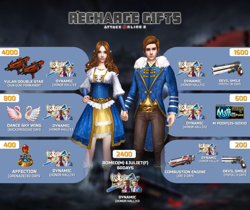 2. 400 AK Gold ទទួលបាន Space treasure chest free coupon*1 + Dynamic (Honor hall)*1 + affection(Grenade) 30Days + MATIC DUEL SET(M/F) Permanent