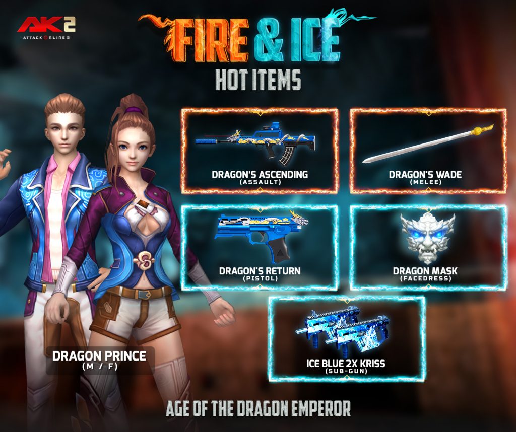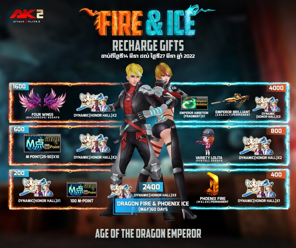 6. 2400 AK Gold ទទួលបាន Space treasure chest free coupon*4 + Dynamic (Honor hall)*3 + Dragon Fire(M)/Phoenix Ice(F) 60Days