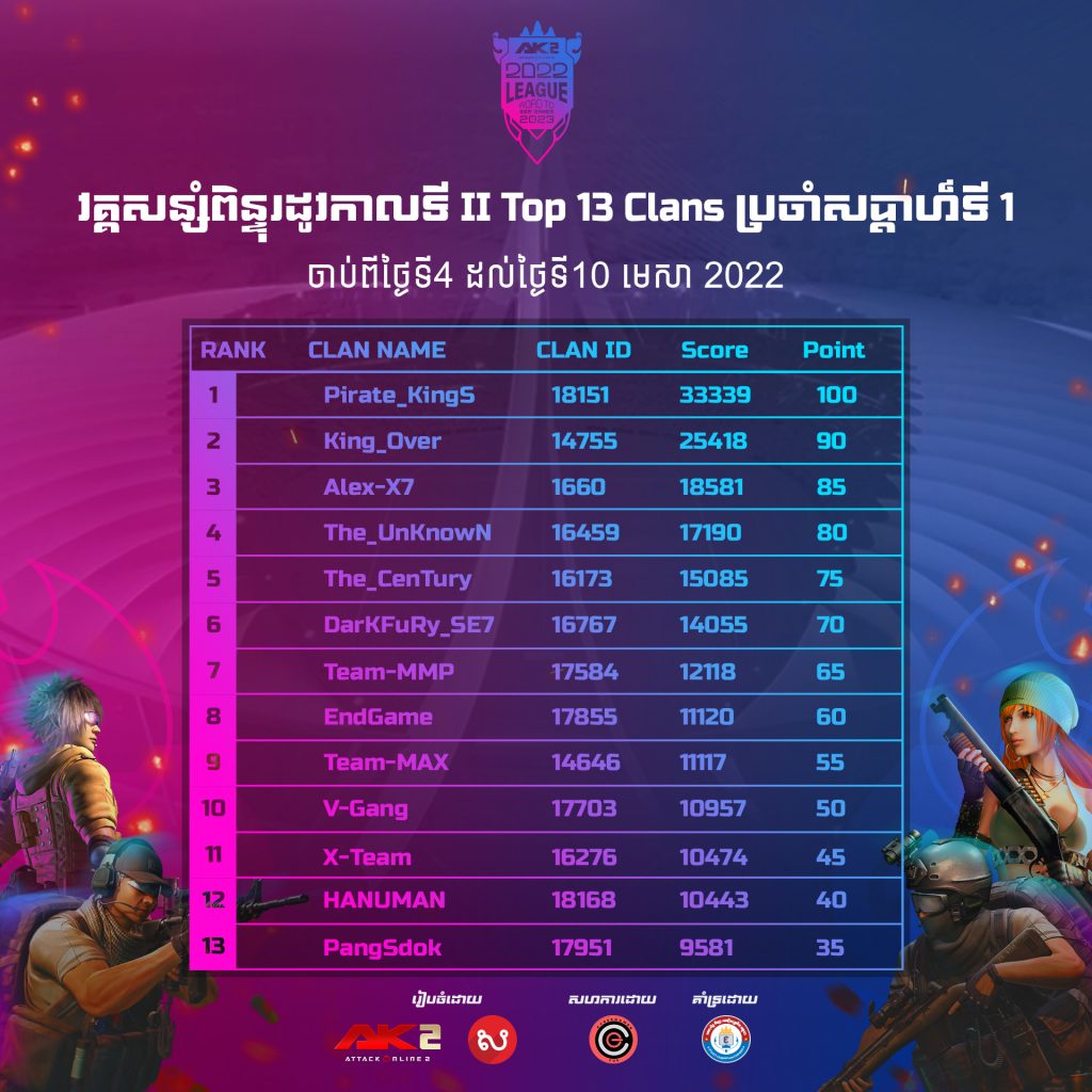 សម្រាប់សប្ដាហ៍ទី1 នេះផងដែរក៏បានស្វែងរកឃើញកំពូល Clan ទាំង13 សុទ្ធសឹងតែជា Clan ដែលបានខិតខំប្រឹងប្រែងរកពិន្ទុយ៉ាងច្រើនទៅកាន់ Clan របស់ខ្លួន ប្រចាំសប្ដាហ៍ទី1 នេះ ។ យ៉ាងណាមិញ ការប្រកួតដេញរកពិន្ទុបានបន្តមកកាន់សប្តាហ៍ទី2 សម្រាប់ Clan ដទៃទៀតអាច នឹងធ្វើការលេងប្រដេញពិន្ទុជាបន្ត។