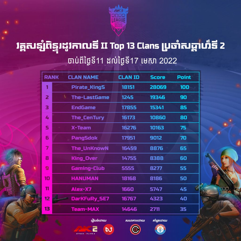 សម្រាប់សប្ដាហ៍ទី2 នេះផងដែរក៏បានស្វែងរកឃើញកំពូល Clan ទាំង13 សុទ្ធសឹងតែជា Clan ដែលបានខិតខំប្រឹងប្រែងរកពិន្ទុយ៉ាងច្រើនទៅកាន់ Clan របស់ខ្លួន ប្រចាំសប្ដាហ៍ទី2 នេះ ។ យ៉ាងណាមិញ ការប្រកួតដេញរកពិន្ទុបានបន្តមកកាន់សប្តាហ៍ទី3 សម្រាប់ Clan ដទៃទៀតអាច នឹងធ្វើការលេងប្រដេញពិន្ទុជាបន្ត។