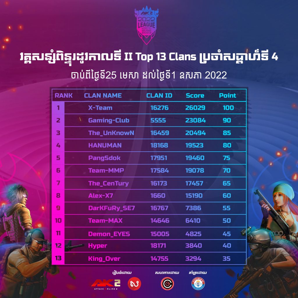 សម្រាប់សប្ដាហ៍ទី4 ក៏បានស្វែងរកឃើញកំពូល Clan ទាំង13 សុទ្ធសឹងតែជា Clan ដែលបានខិតខំប្រឹងប្រែងរកពិន្ទុយ៉ាងច្រើនទៅកាន់ Clan របស់ខ្លួន ប្រចាំសប្ដាហ៍ទី3 នេះ ។ យ៉ាងណាមិញ ការប្រកួតដេញរកពិន្ទុបានបន្តមកកាន់សប្តាហ៍ទី5 សម្រាប់ Clan ដទៃទៀតអាច នឹងធ្វើការលេងប្រដេញពិន្ទុជាបន្ត។