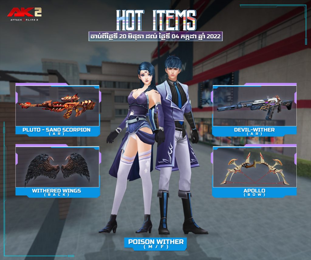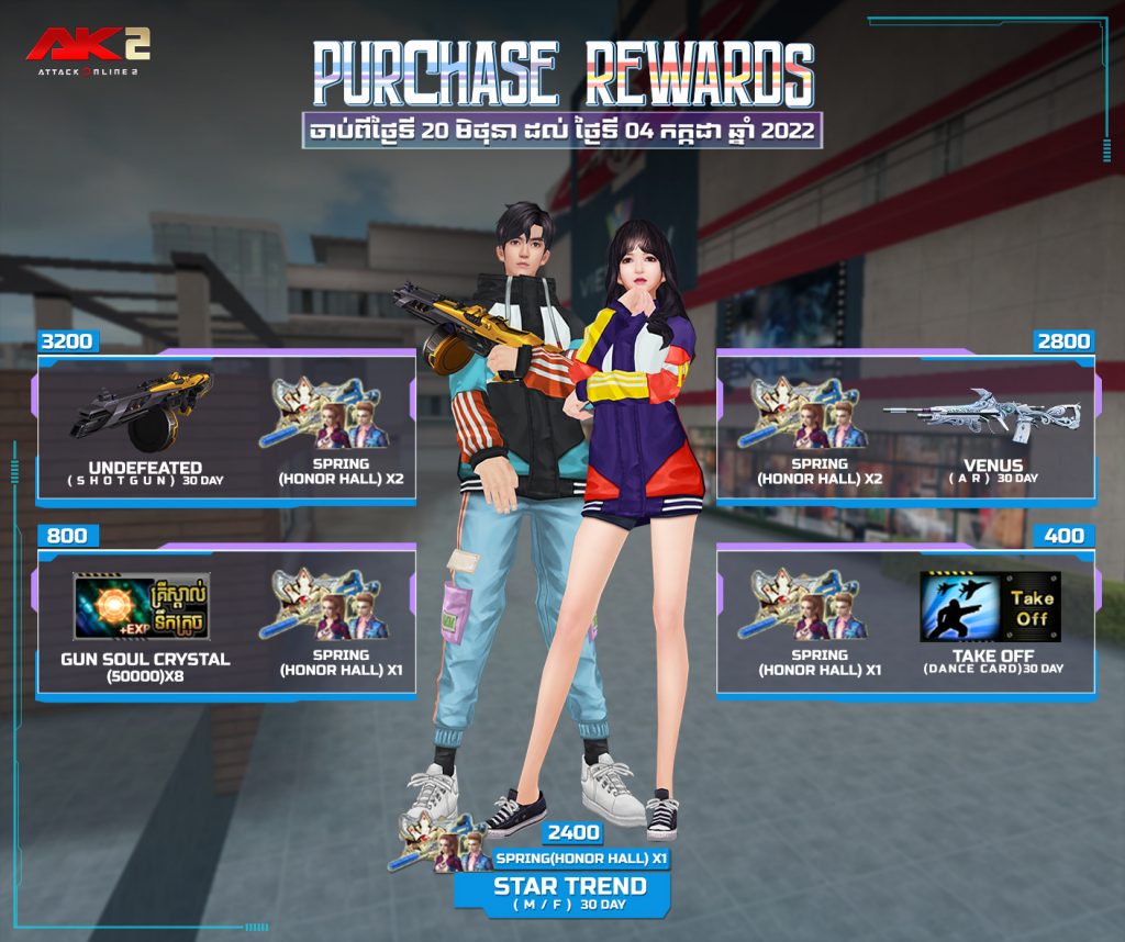 ចាប់ពី ថ្ងៃទី20 ខែមិថុនា ដល់ ថ្ងៃទី03 ខែកក្កដា ឆ្នាំ2022 បន្ទាប់ពីការ update នូវ version 2.1.6.696 ទៅ 2.1.6.697 រួចរាល់ហើយអ្នកកម្សាន្ដទាំងអស់អាចចំណាយ AK Gold ដើម្បីទទួលបានសម្ភារៈពិសេសៗដូចខាងក្រោម៖