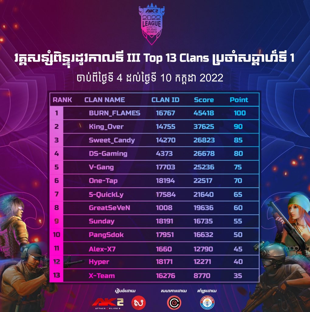 សម្រាប់សប្ដាហ៍ទី1 ក៏បានស្វែងរកឃើញកំពូល Clan ទាំង13 សុទ្ធសឹងតែជា Clan ដែលបានខិតខំប្រឹងប្រែងរកពិន្ទុយ៉ាងច្រើនទៅកាន់ Clan របស់ខ្លួន ប្រចាំសប្ដាហ៍ទី1 នេះ ។ យ៉ាងណាមិញ ការប្រកួតដេញរកពិន្ទុបានបន្តមកកាន់សប្តាហ៍ទី2 សម្រាប់ Clan ដទៃទៀតអាច នឹងធ្វើការលេងប្រដេញពិន្ទុជាបន្ត។