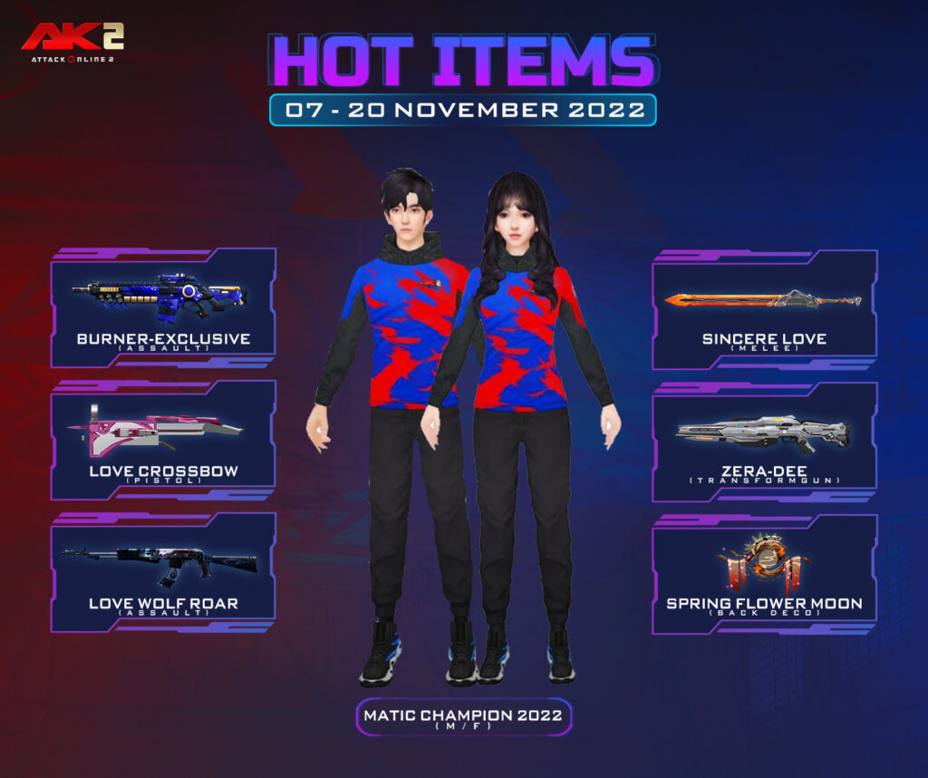 ចាប់ពី ថ្ងៃទី07 ខែវិច្ឆិកា ដល់ ថ្ងៃទី20 ខែវិច្ឆិកា ឆ្នាំ2022 បន្ទាប់ពីការ update នូវ version 2.1.6.708 ទៅ 2.1.6.709 រួចរាល់ហើយអ្នកកម្សាន្ដទាំងអស់អាចចំណាយ AK Gold ដើម្បីទទួលបានសម្ភារៈពិសេសៗដូចខាងក្រោម៖