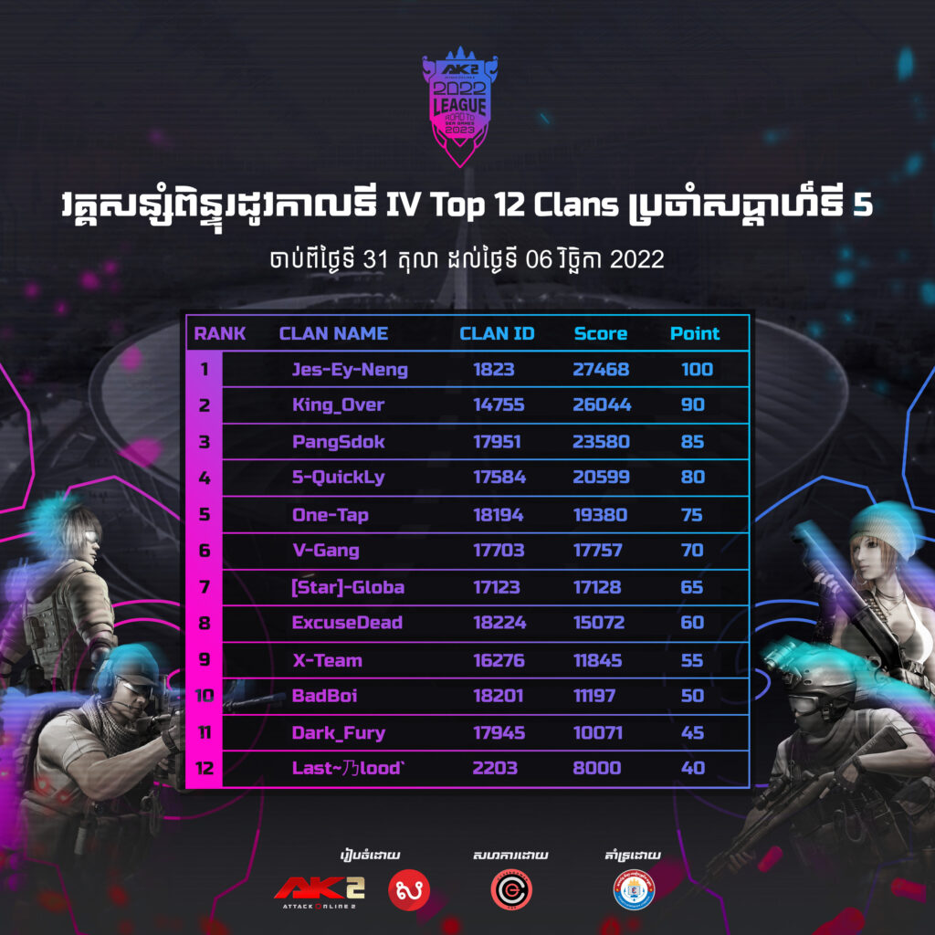 សម្រាប់សប្ដាហ៍ទី5 ក៏បានស្វែងរកឃើញកំពូល Clan ទាំង12 សុទ្ធសឹងតែជា Clan ដែលបានខិតខំប្រឹងប្រែងរកពិន្ទុយ៉ាងច្រើនទៅកាន់ Clan របស់ខ្លួន ។ យ៉ាងណាមិញ ការប្រកួតដេញរកពិន្ទុបានបន្តមកកាន់សប្តាហ៍ទី6 សម្រាប់ Clan ដទៃទៀតអាច នឹងធ្វើការលេងប្រដេញពិន្ទុជាបន្ត។