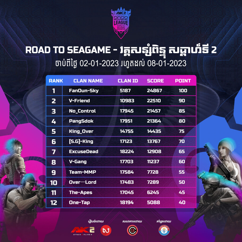 សម្រាប់វគ្គសន្សំពិន្ទុ Team Challenge ដែលមានចំនួនសរុប 4 សប្ដាហ៍ និងកំណត់យក Top 12 Clans មកកាន់ការប្រកួតវគ្គជម្រុះ SEA Games 2023។
