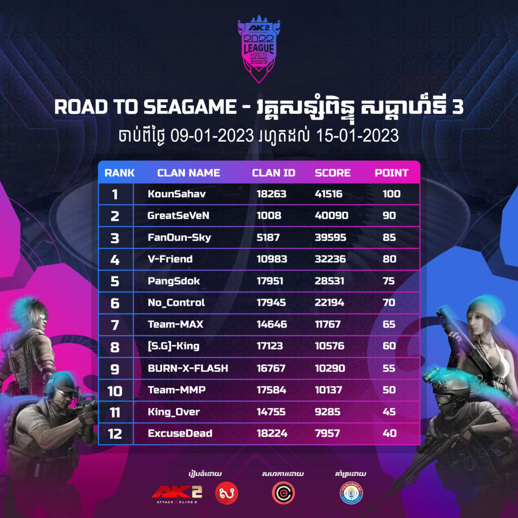 សម្រាប់វគ្គសន្សំពិន្ទុ Team Challenge ដែលមានចំនួនសរុប 4 សប្ដាហ៍ និងកំណត់យក Top 12 Clans មកកាន់ការប្រកួតវគ្គជម្រុះ SEA Games 2023។